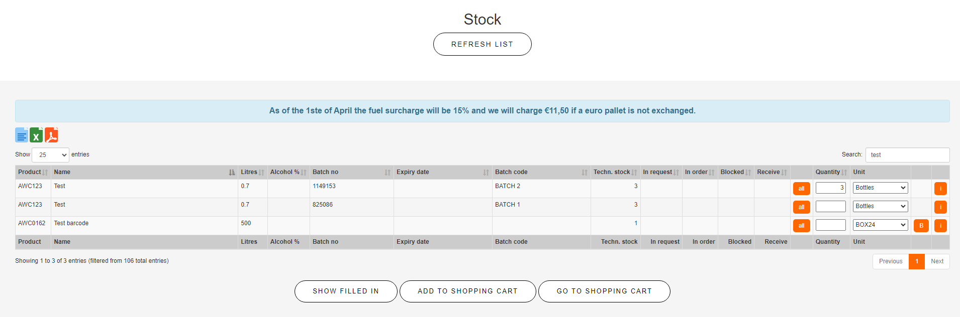 When you press this button, the article is divided among the existing batches, behind the article you can indicate how many bottles of which batch you want to request for the order, and add it to your shopping cart.