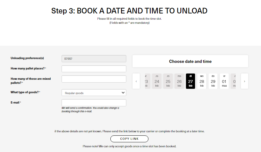 You can forward this link to your carrier if you don't know when the goods will arrive at our warehouse, they can book the timeslot themself with this link.